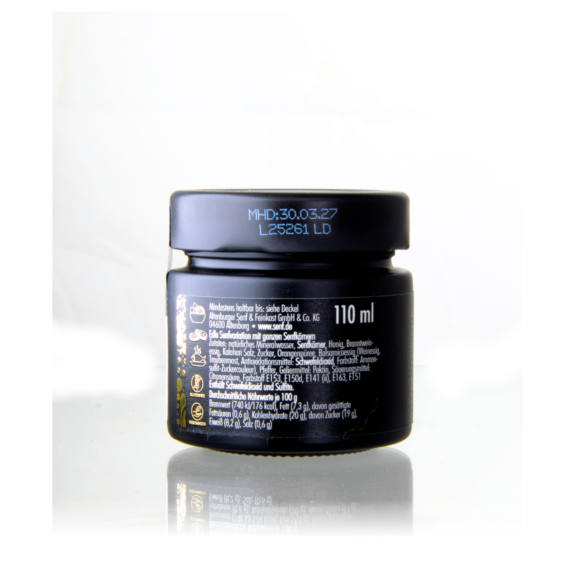 natürliches Mineralwasser, Senfkörner, Honig, Branntweinessig, Kalahari Salz, Zucker, Orangenpüree, Balsamicoessig (Weinessig, Traubenmost, Antioxidationsmittel: Schwefeldioxid, Farbstoff: Ammonsulfit-Zuckercouleur), Pfeffer, Geliermittel: Pektin, Säuerungsmittel: Citronensäure, Farbstoff E153, E150d, E141 (ii), E163, E151