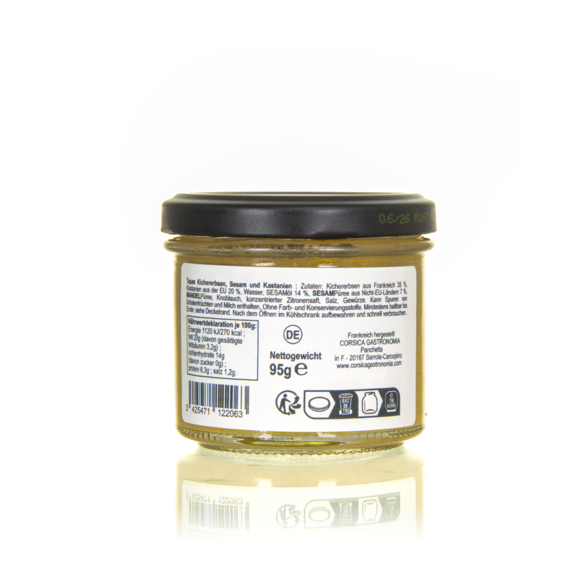 Kichererbsen aus Frankreich 35 %, Kastanien aus der EU 20 %, Wasser, Sesamöl 14 %, Sesampüree (Nicht-EU-Ursprung) 7 %, Mandelpüree, Knoblauch, konzentrierter Zitronensaft, Salz, Gewürze