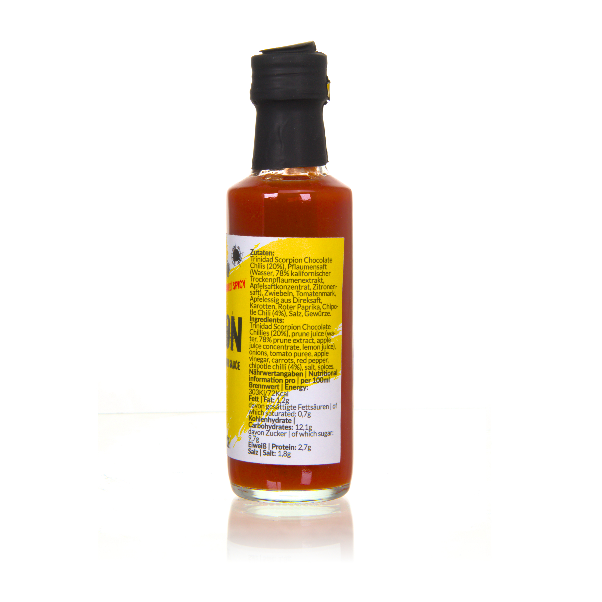 Trinidad Scorpion Chocolate Chilis (20%), Pflaumensaft (Wasser, 78% kalifornischer Trockenpflaumenextrakt, Apfelsaftkonzentrat, Zitronensaft), Zwiebeln, Tomatenmark, Apfelessig aus Direksaft, Karotten, Roter Paprika, Chipotle Chili (4%), Salz, Gewürze