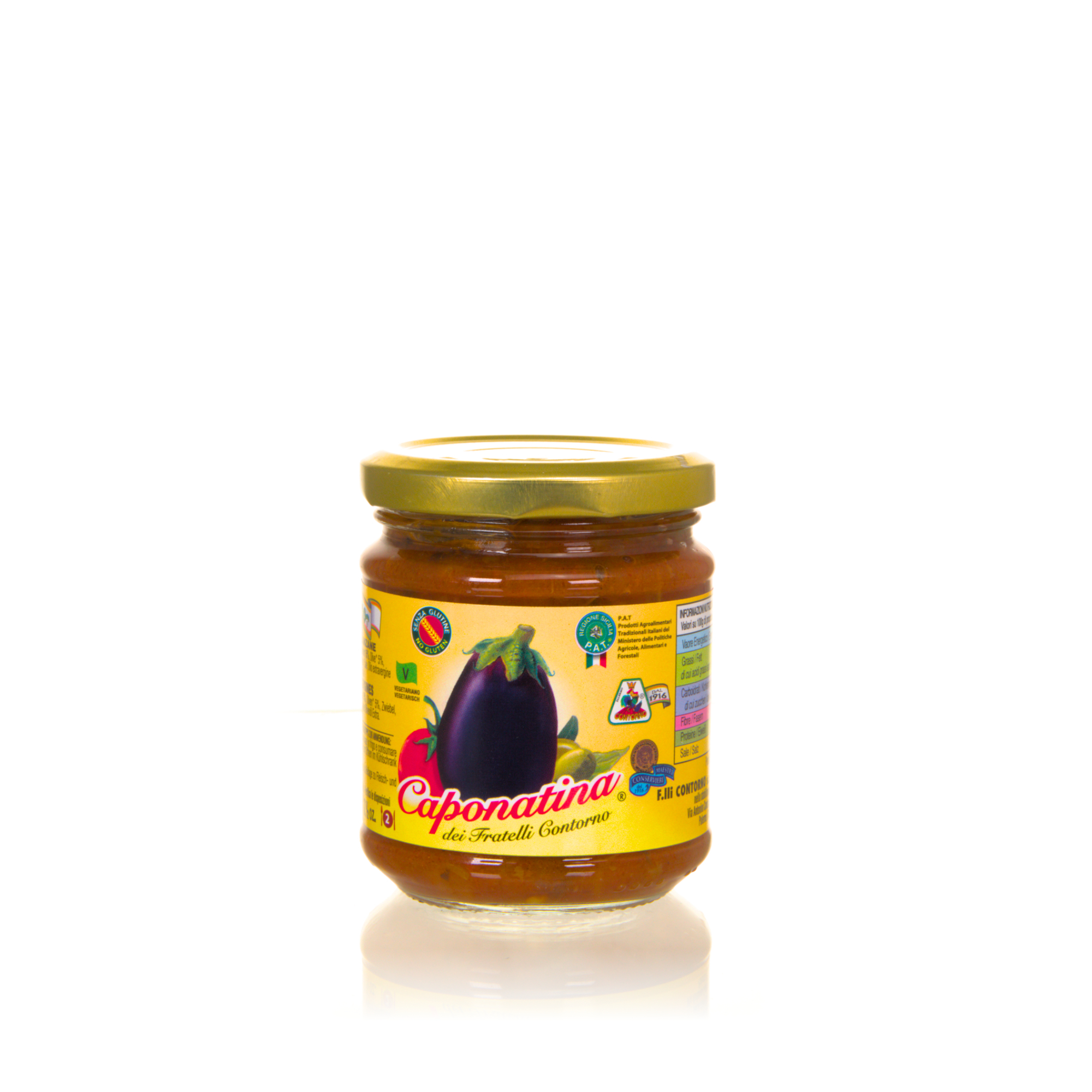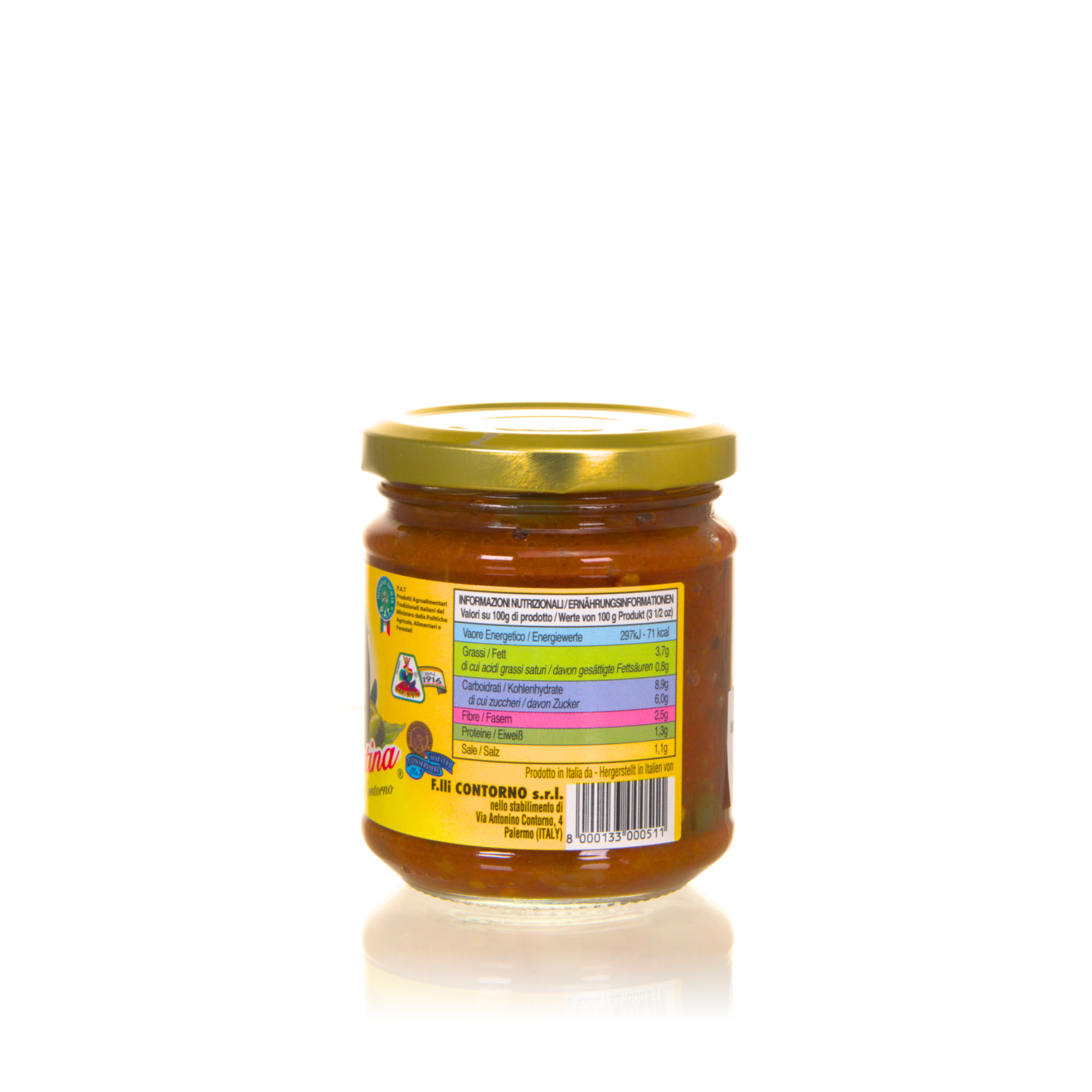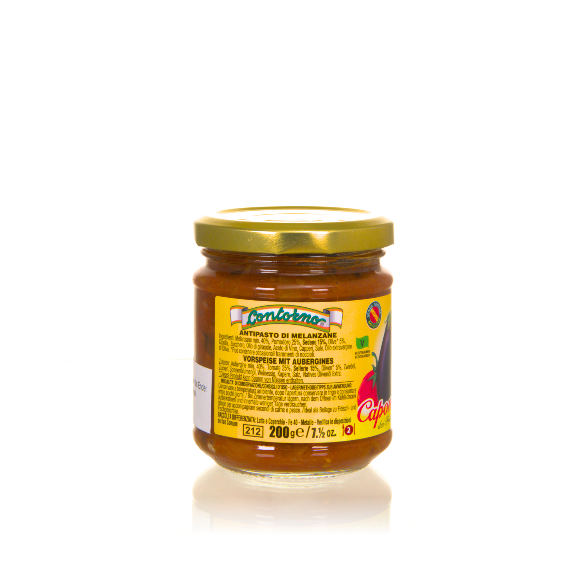 Zutaten: Auberginen min 40%, Tomaten 25%, Sellerie 15%, Oliven 5%, Zwiebel, Zucker, Sonnenblumenöl, Weinessig, Kapern, Salz, Natives Olivenöl Extra