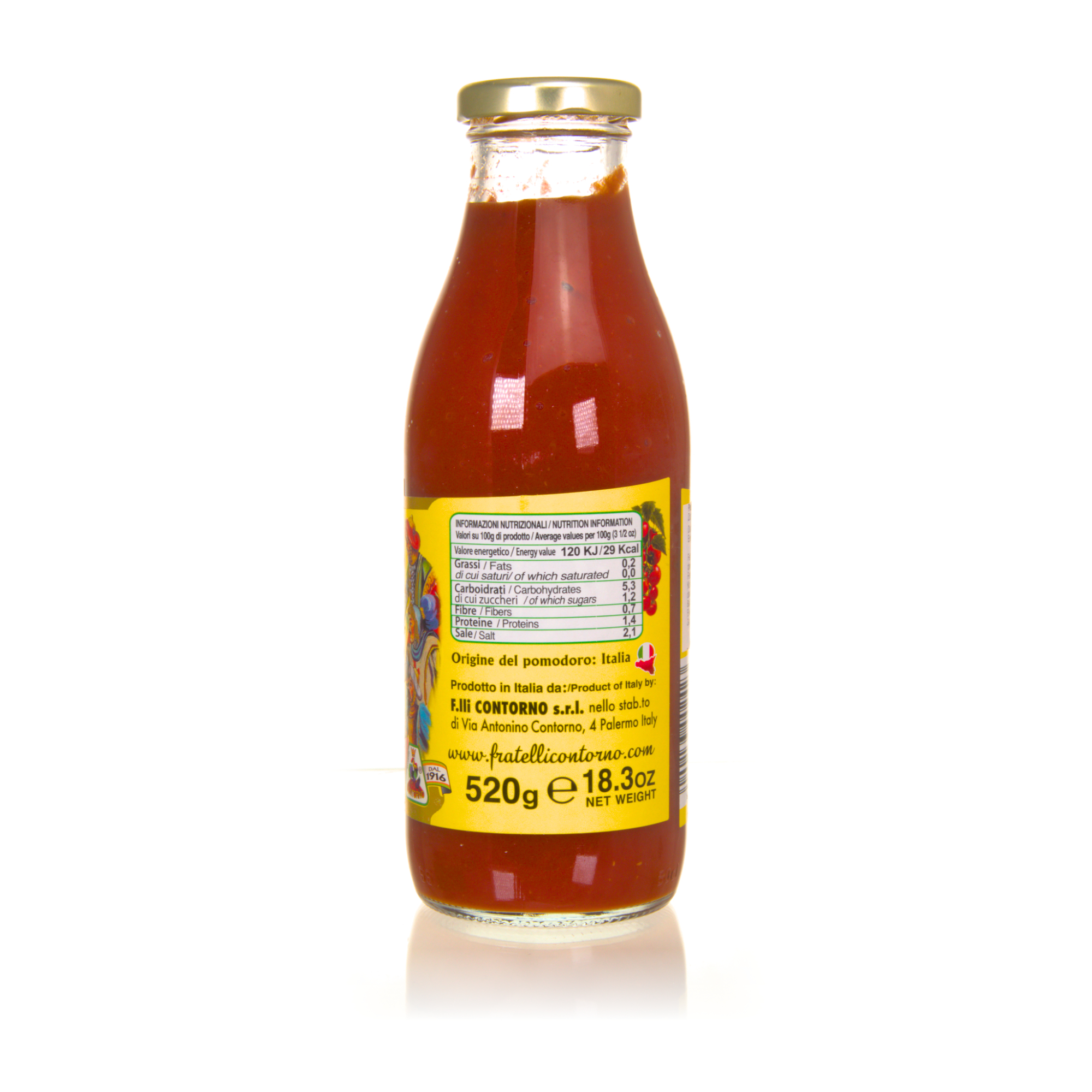 Contorno Passata di Pomodoro con Ciliegino vereint den Geschmack von klassischen passierten Tomaten mit dem intensiven Aroma sonnengereifter Kirschtomaten. Die samtige Konsistenz und die natürliche Süße sorgen für eine besonders fruchtige, ausgewogene Geschmacksbasis. Ideal für Pasta-Saucen, Pizza oder mediterrane Schmorgerichte. Authentischer Tomatengenuss – vielseitig, aromatisch und typisch italienisch.