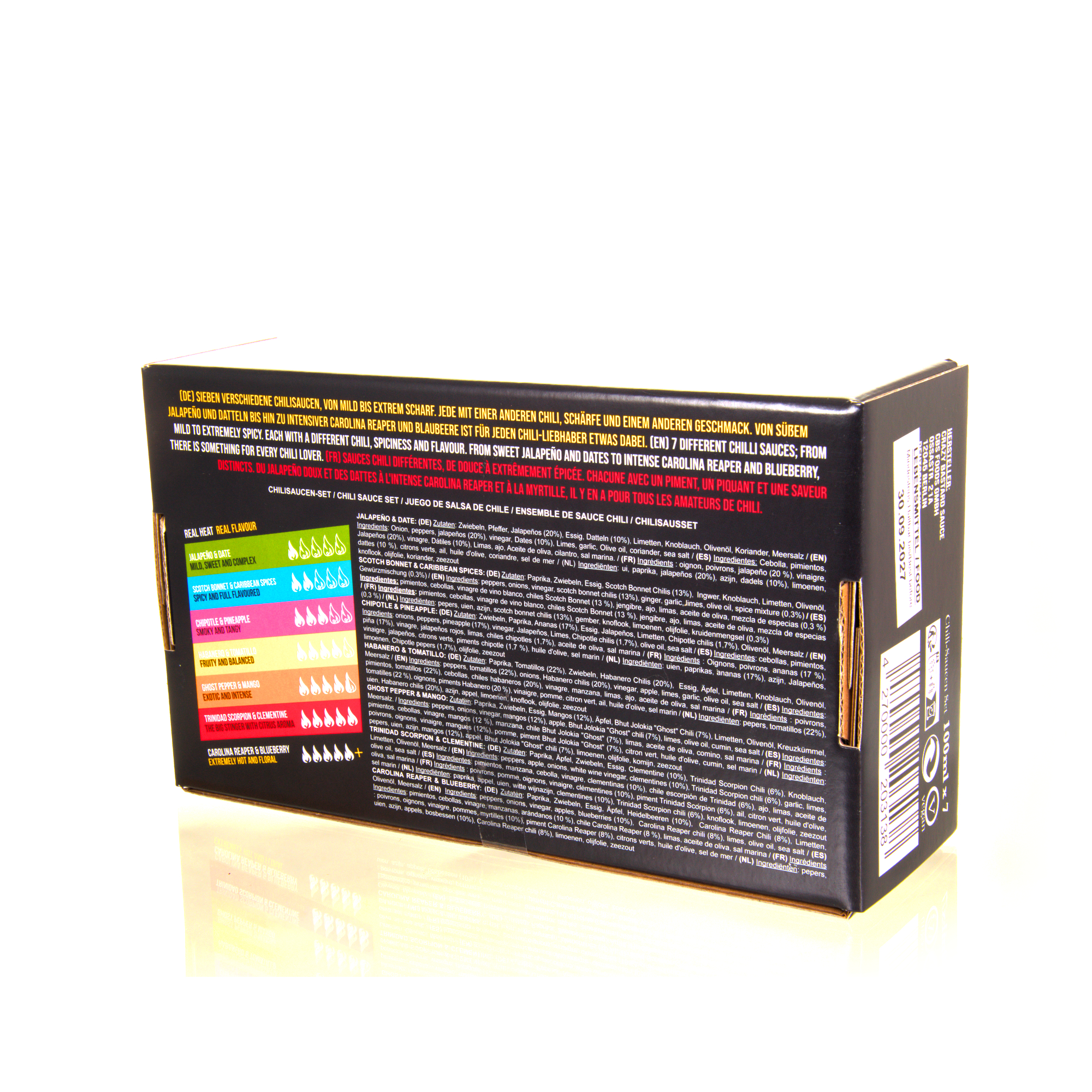 Das Set beinhaltet je eine Flasche mit jeweils 100ml der folgenden Sorten: Jalapeno & Date, Scotch Bonnet & Carribean Spices, Chipotle & Pineapple, Habanero & Tomatillo, Ghost Pepper & Mango, Trinidad Scorpion & Clementine, Carolina Reaper & Blueberry