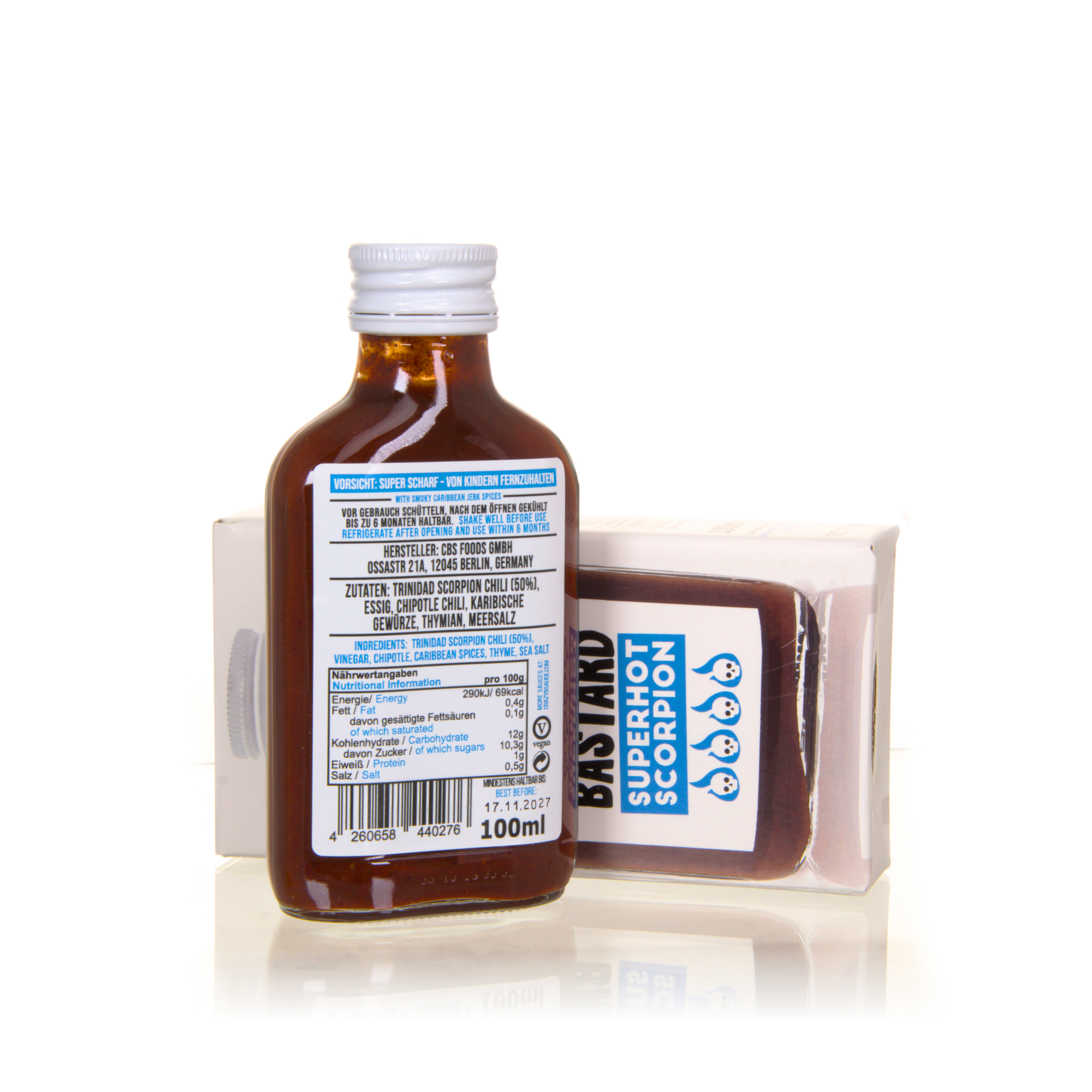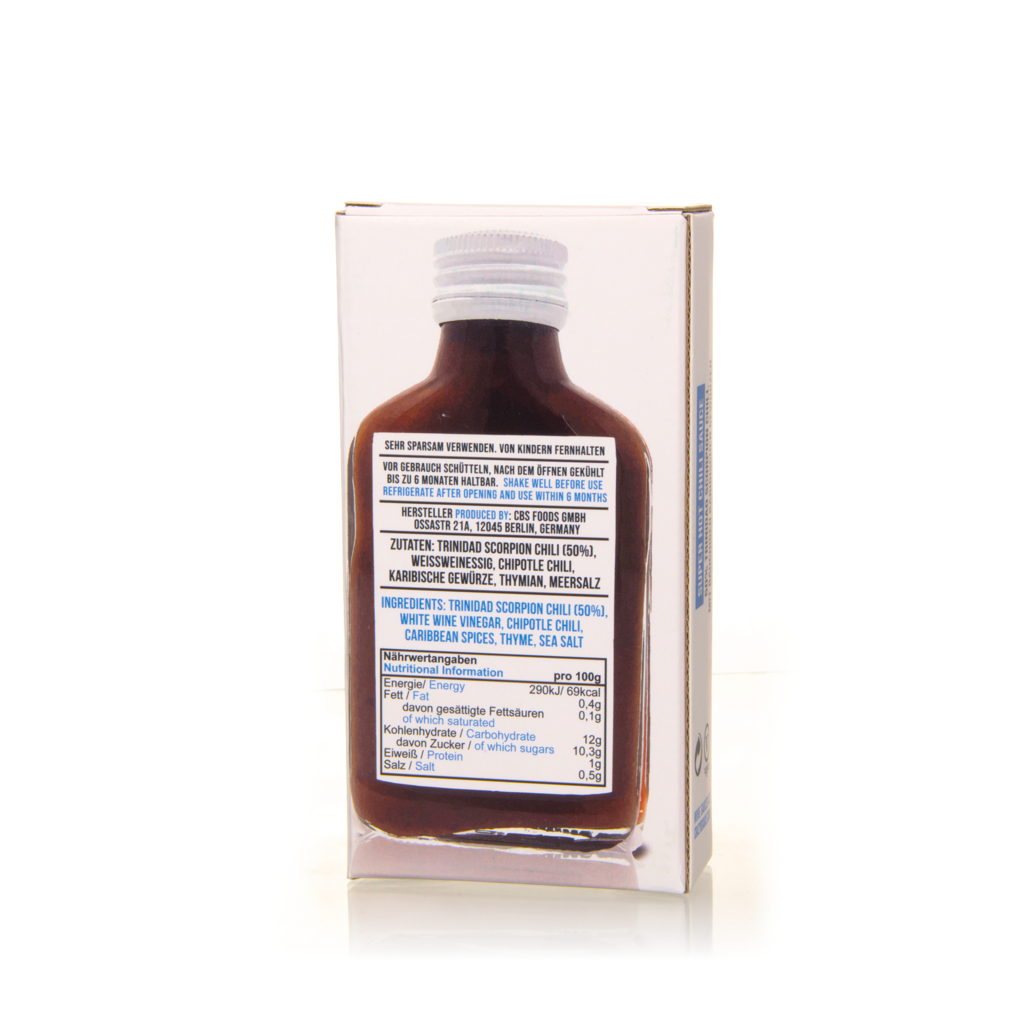 Hergestellt mit 50% Trinidad Scorpion Chili und rauchigen karibischen Gewürzen.