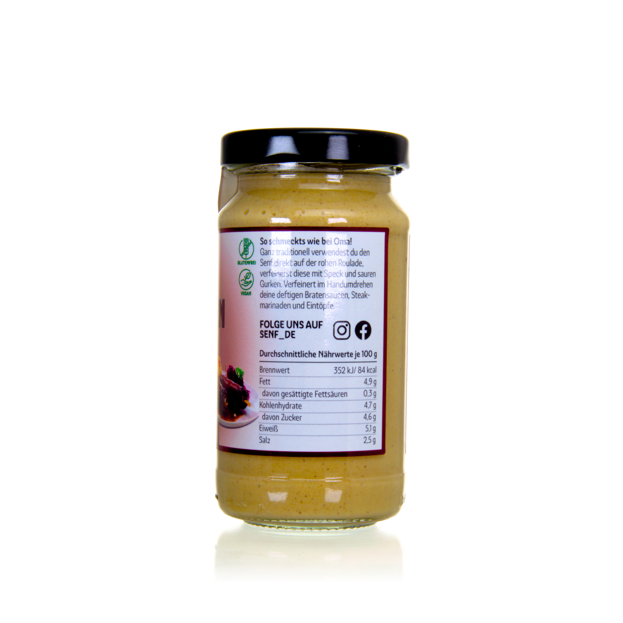 Bei diesem mittelscharfen Senf mit feiner Würze is(s)t der Name Programm. Egal ob zur Rinds- oder Kohlroulade mit dem Rouladen Senf bist du geschmacklich auf der sicheren Seite.