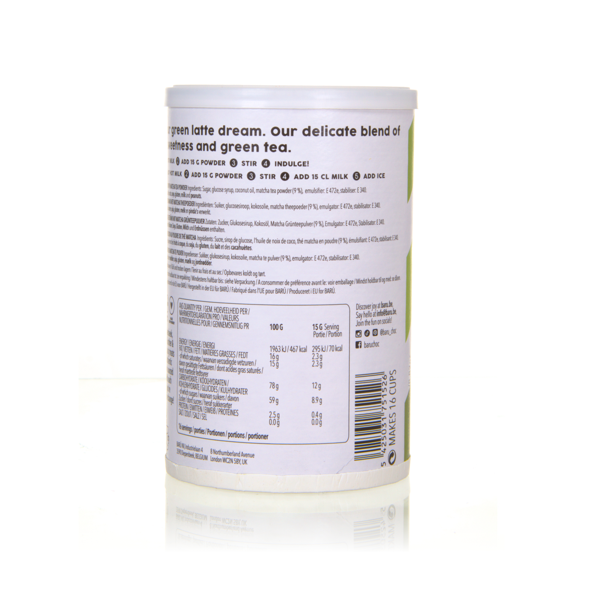 Barú Matcha Latte sorgt in wenigen Augenblicken für cremigen Genuss mit feiner Grüntee-Note. Ob mit klassischer Milch oder einem pflanzlichen Drink zubereitet – im Handumdrehen entsteht ein leckerer Matcha Latte mit angenehm samtiger Textur. Der ausgewogene Geschmack macht ihn zur idealen Wahl für entspannte Auszeiten oder als aromatische Alternative zu Kaffee.