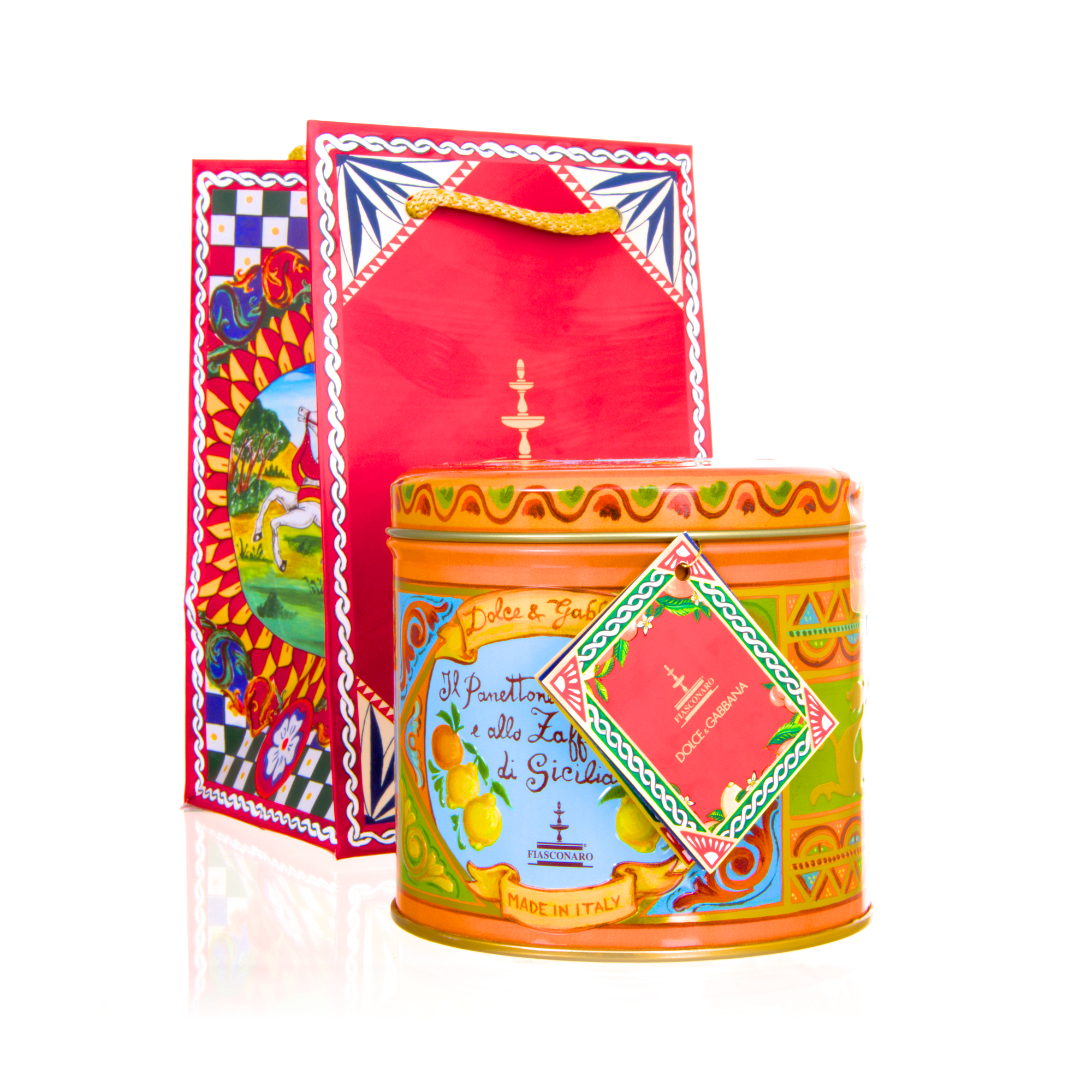 Zarte kandierte Zitrusfrüchte wie Orangen und Zitronen in Kombination mit aromatischem, sizilianischem Safran verleihen dem Panettone-Teig einen unverwechselbaren Geschmack und Saftigkeit. Die farbenfrohen Designs der Metalldose stammen von Dolce & Gabbana.