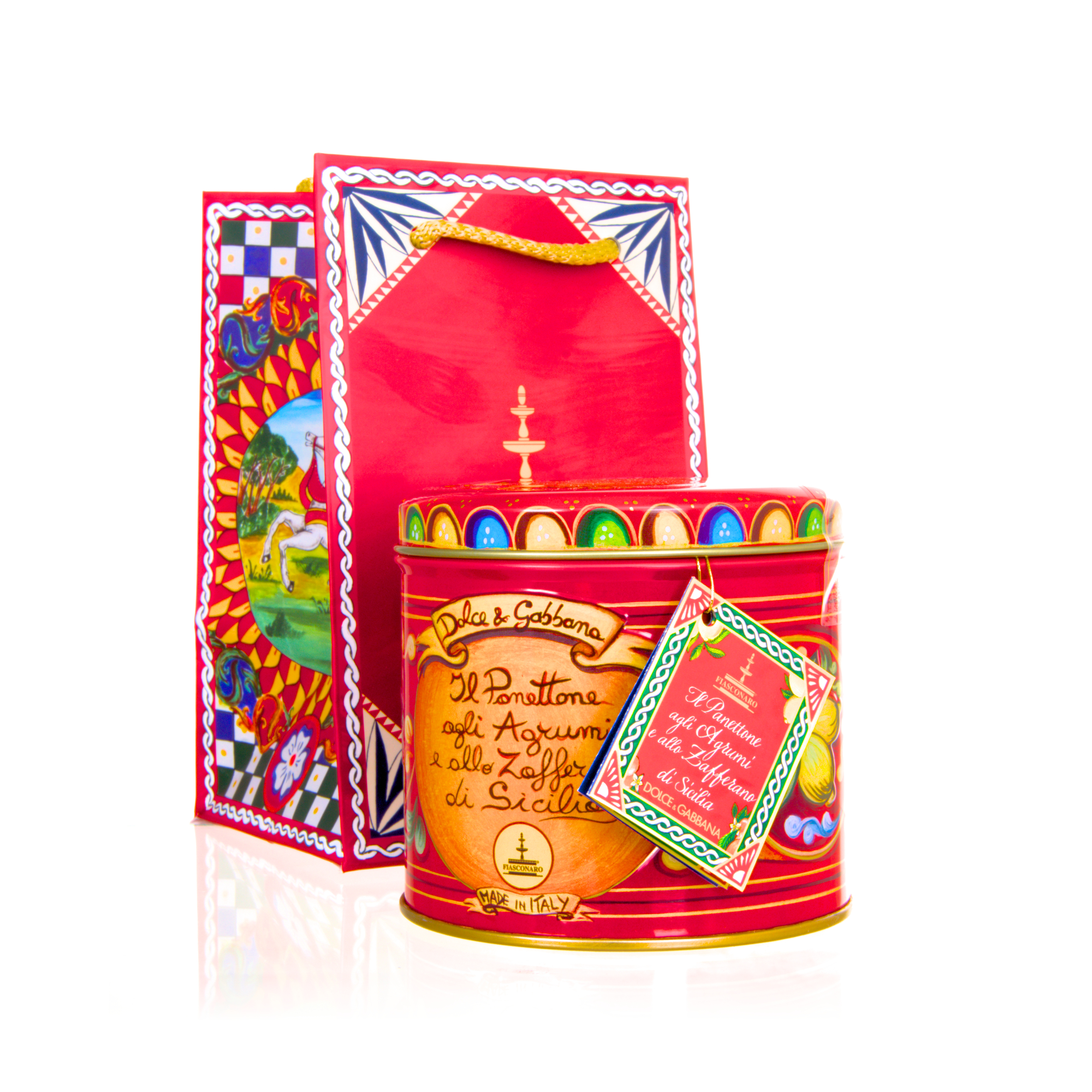 Zarte kandierte Zitrusfrüchte wie Orangen und Zitronen in Kombination mit aromatischem, sizilianischem Safran verleihen dem Panettone-Teig einen unverwechselbaren Geschmack und Saftigkeit. Die farbenfrohen Designs der Metalldose stammen von Dolce & Gabbana.