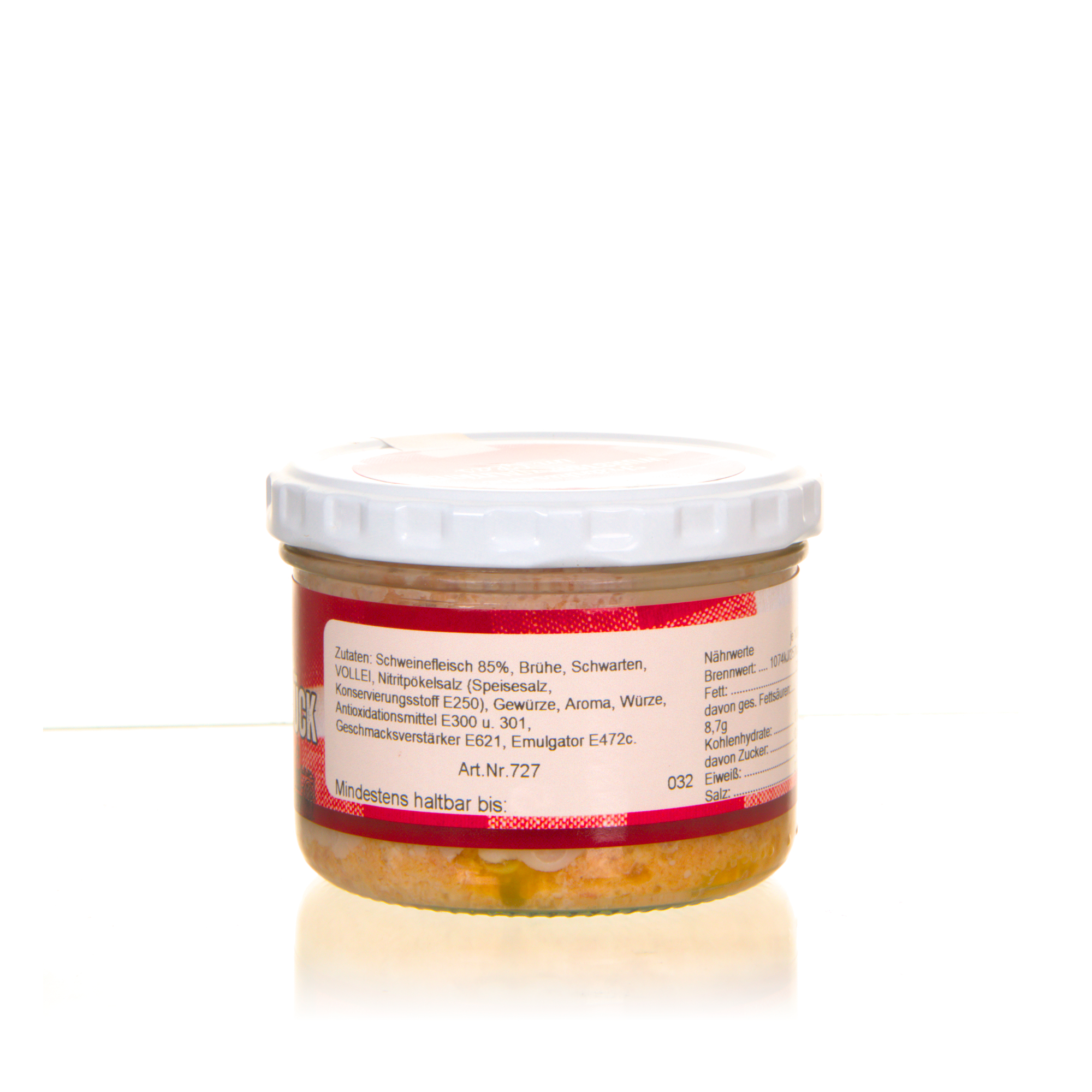 Schweinefleisch (85%), Fleischbrühe, Schwarten, Vollei, Emulgator E471, Speisesalz, Konservierungsstoff E250, Gewürze, Dextrose, Aroma, Geschmacksverstärker E621, Antioxidationsmittel E300