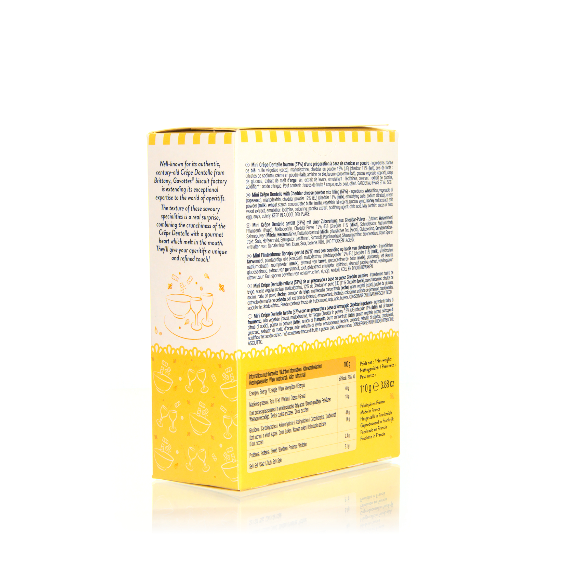 Knusprige, fein gerollte Crêpe-Snacks mit einer cremigen Cheddarfüllung. Die zarte, goldbraun gebackene Crêpehülle trifft auf eine würzige, leicht pikante Käsenote und sorgt für ein ausgewogenes, herzhaftes Geschmackserlebnis. Ideal als Apéritif, zum Snacken oder als raffinierte Ergänzung auf der Vorspeisenplatte. Französischer Genuss mit knusprigem Biss und cremigem Kern.