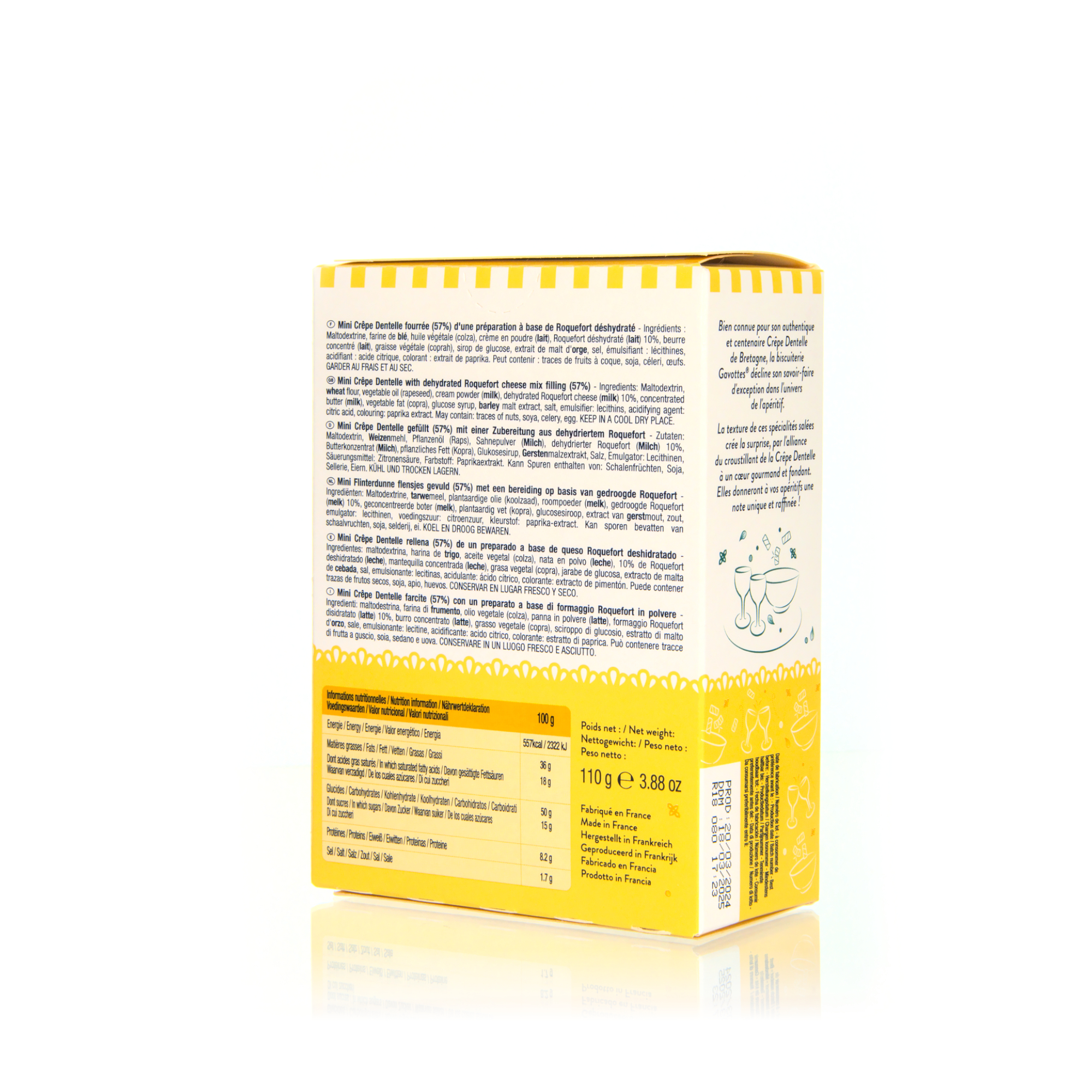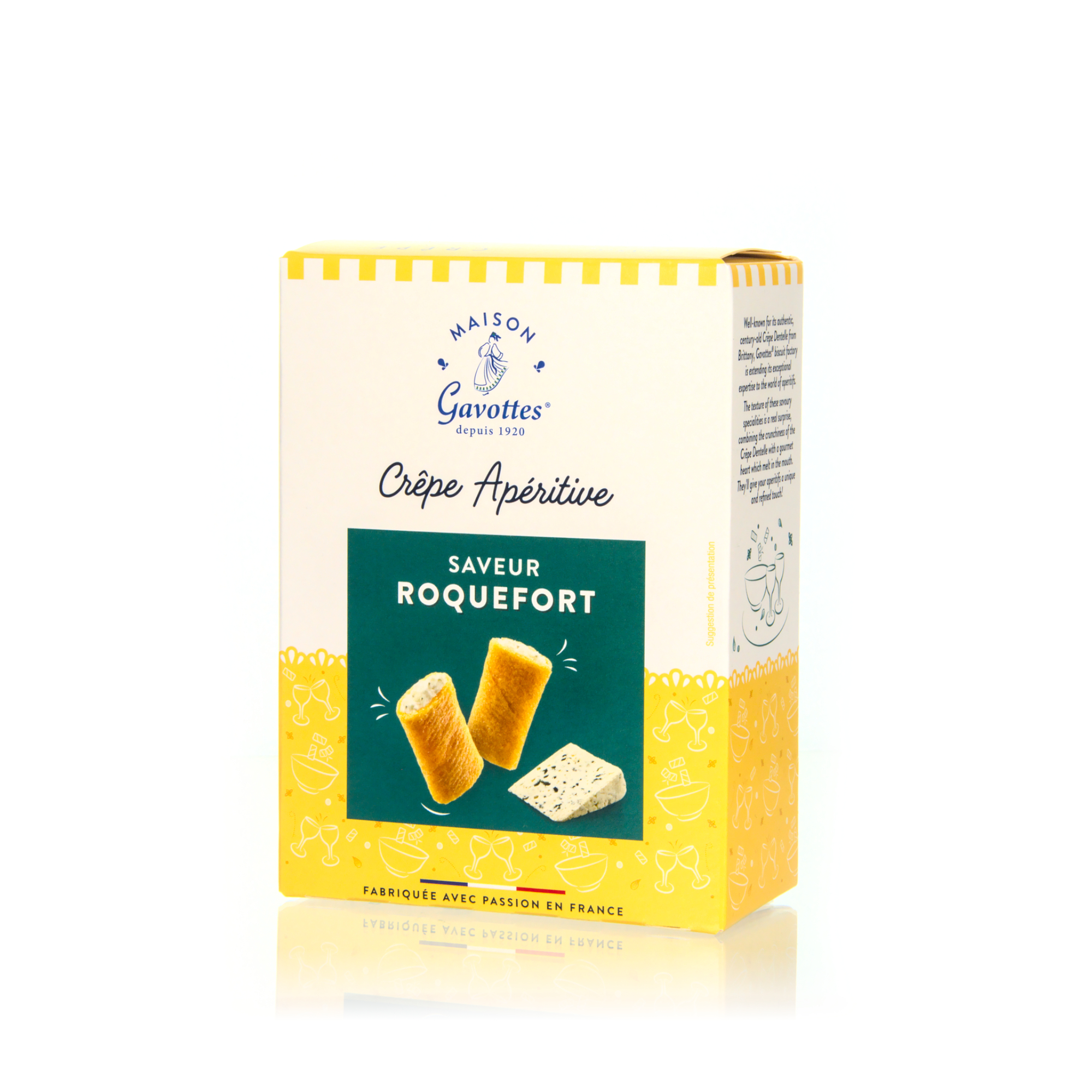 Maison Gavottes Crêpe Apéritif – Creperolles mit Roquefort-Cremefüllung sind knusprige, fein gerollte Crêpe-Snacks mit einer cremigen Füllung aus würzigem Roquefortkäse. Die zarte, goldbraun gebackene Crêpehülle harmoniert perfekt mit dem intensiven, leicht pikanten Käsearoma und sorgt für ein raffiniertes Geschmackserlebnis. Ideal als Apéritif, zum Snacken oder als besondere Ergänzung auf der Käse- oder Vorspeisenplatte. Französischer Genuss mit Charakter und feiner Würze.