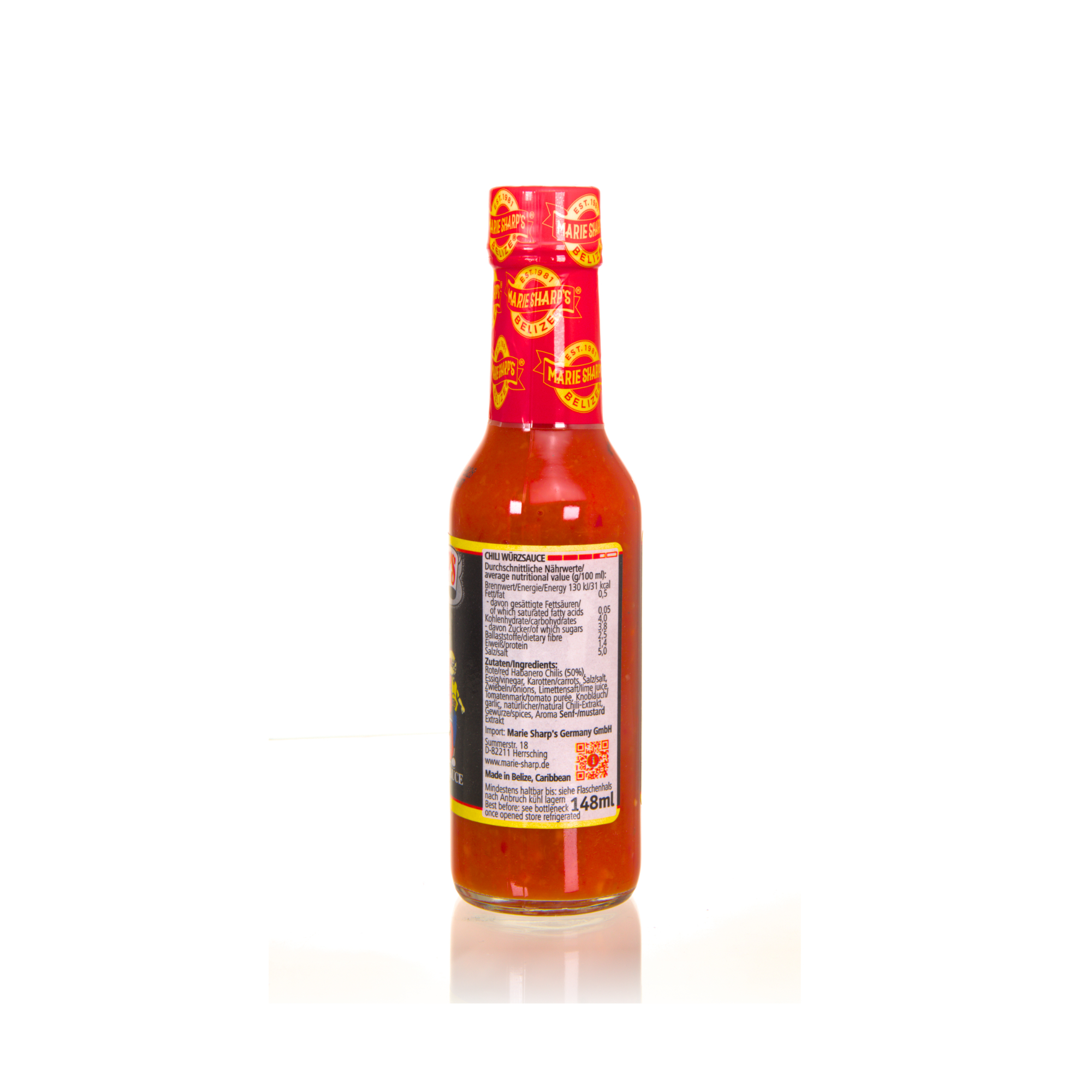 rote Habanero Chili 50%, Essig, Karotten, Salz, Zwiebeln, Limettensaft, Tomatenmark, Knoblauch, natürlicher Chiliextrakt, Gewürze, Aroma: Senfextrakt