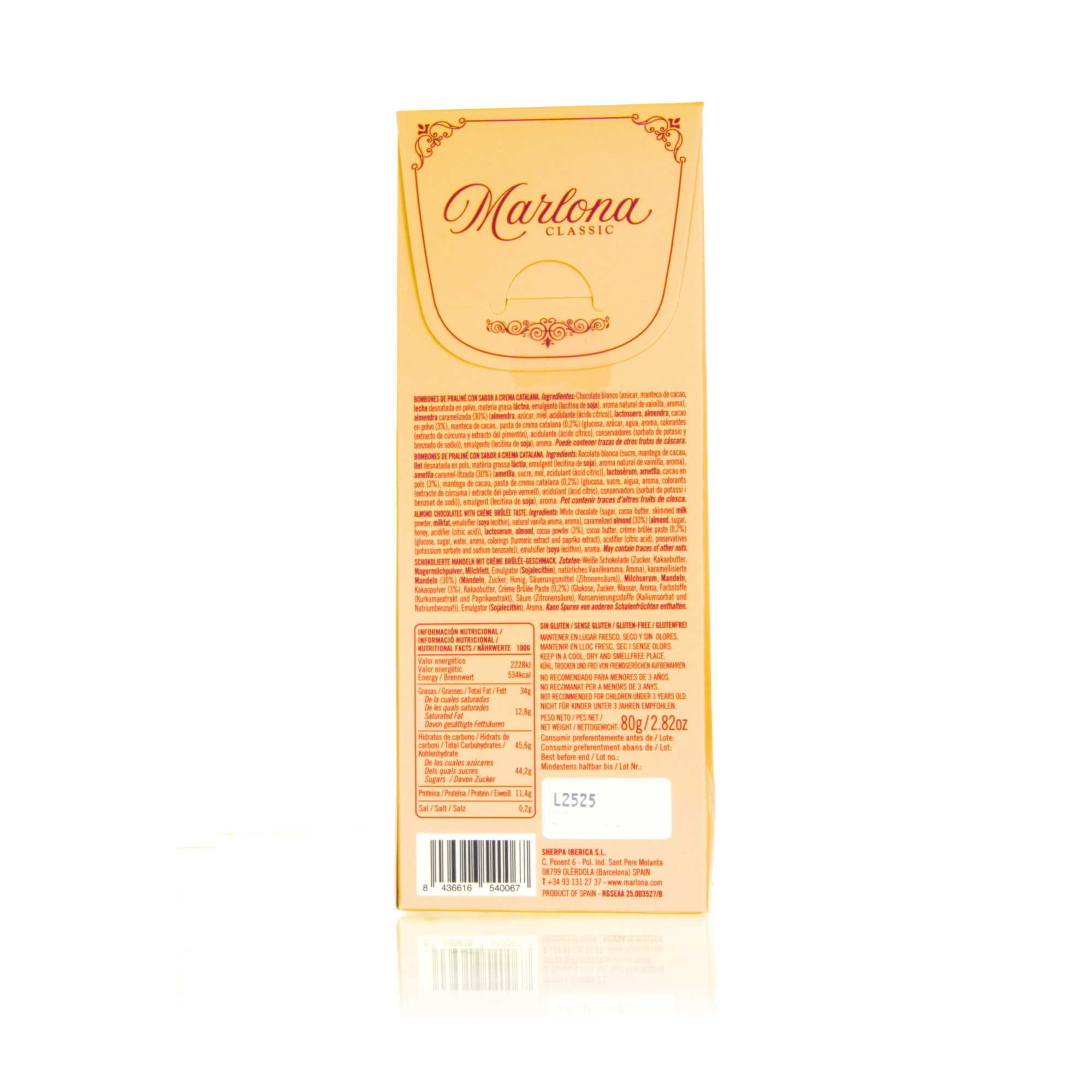 Knackige, karamellisierte spanische Mandeln umhüllt mit Schokolade Crema Catalana mit einem Hauch Kakaopulver bestreut. Die cremige Hülle und die knackige Mandeln machen die Marlona Classic Crema Catalana zu einem ganz besonderen Genuss.