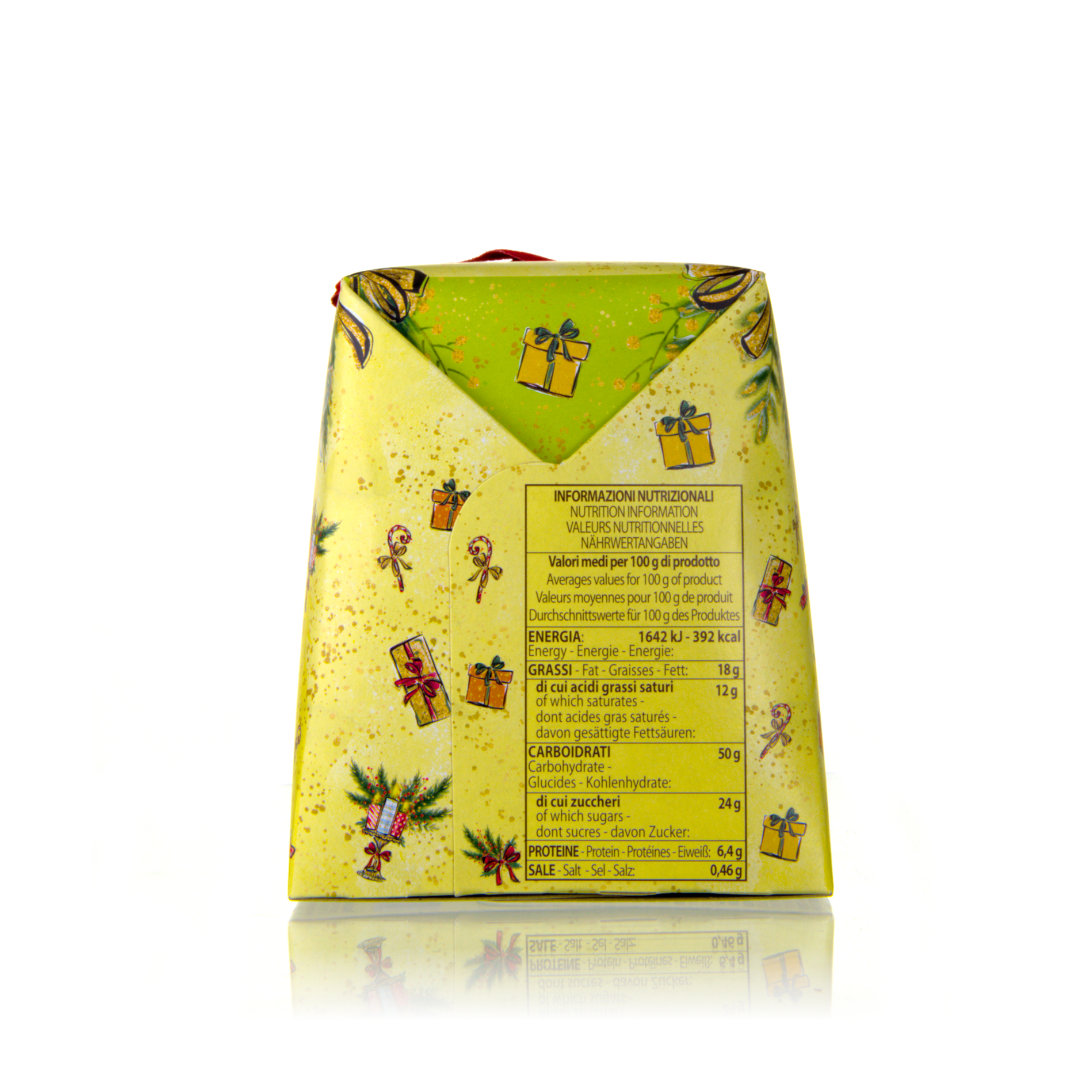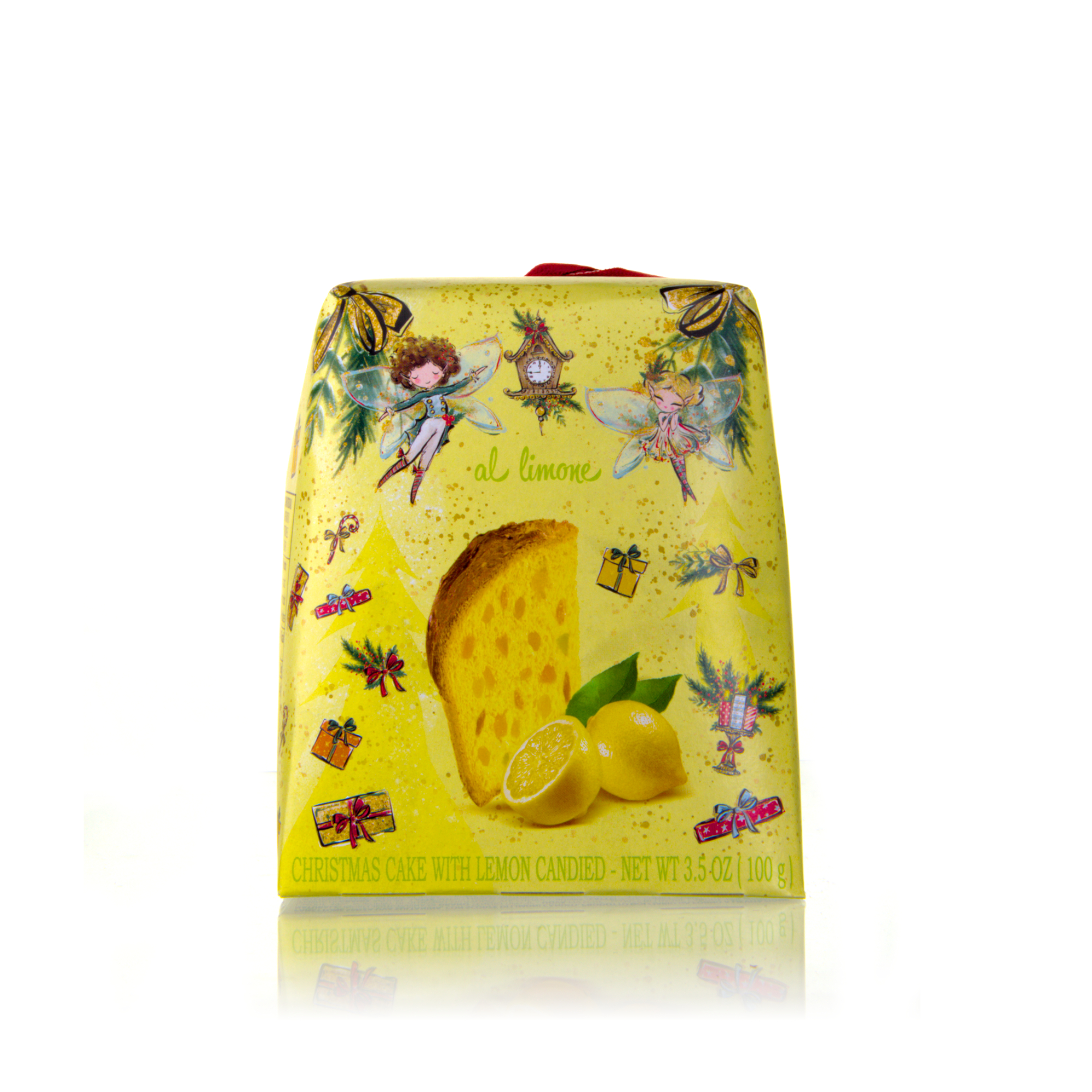 Kleiner, luftiger Panettone, gebacken ohne Rosinen dafür mit vielen kandierten Zitronenschalen. Verpackt in einer verspielten Weihnachts-Geschenkverpackung.